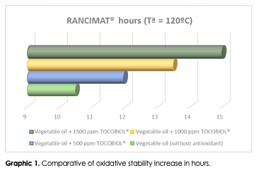 A continuación, el siguiente ensayo realizado por la compañía sobre un aceite vegetal comercial pretende mostrar la eficacia antioxidante de TOCOBIOL®. Dicho ensayo se ha llevado a cabo en un dispositivo RANCIMAT®, el cual tiene la capacidad de realizar un estudio comparativo de oxidación acelerada con muestras a diferentes dosis de antioxidante.