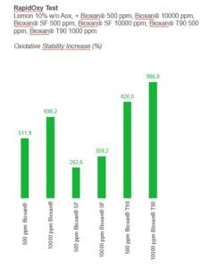 Samples of lemon and orange essential oils were treated with Bioxan®, Bioxan® SF, and Bioxan® T90, at dosages of 500 ppm and 1000 ppm.