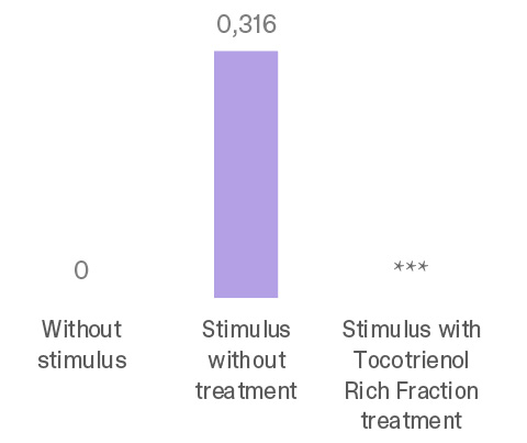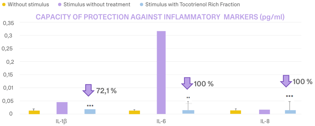 The anti-inflammatory activity of Bioxan® Tocotrienols (1%) was assessed in stimulated human keratinocytes by measuring pro-inflammatory cytokine production.