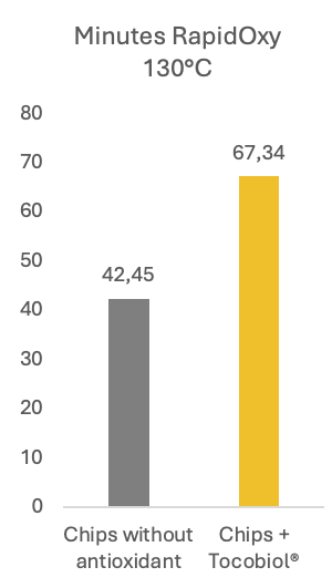 • Chips: the addition of Tocobiol® directly into the frying oil showed a remarkable carry-through effect, significantly improving the oxidative stability of the final fried potato chips. This translated into a longer shelf life and delayed development of rancidity compared to untreated controls.