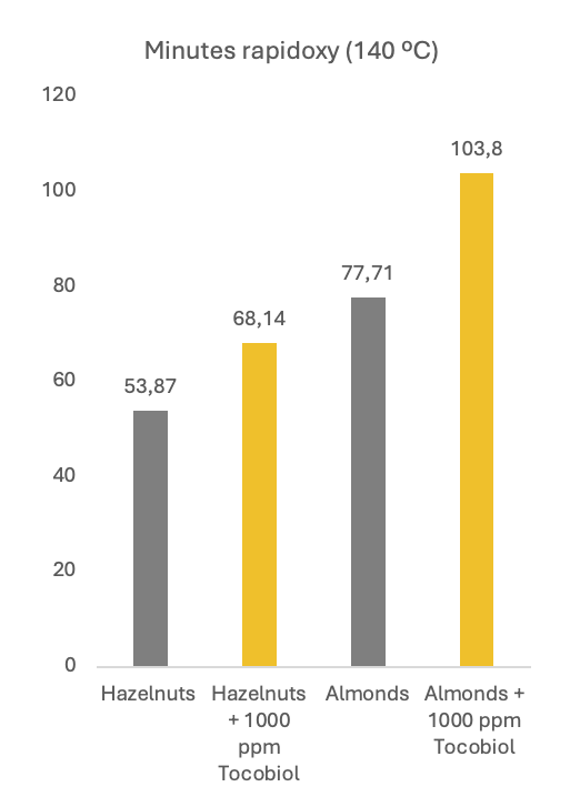 • Nuts: in trials with almonds and hazelnuts, Tocobiol® effectively stabilized the natural oil fraction, protecting these highly oxidation-prone products. Analytical tests and sensory evaluations demonstrated that Tocobiol® helped to preserve flavor, crunchiness, and nutritional value over extended storage periods.