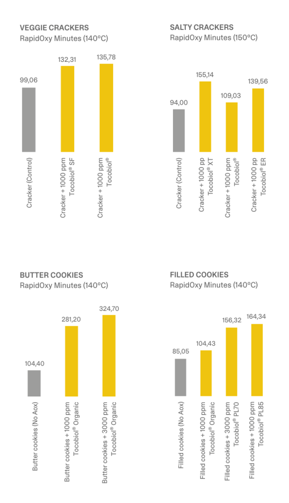 Real-world testing demonstrates the superior performance of Tocobiol® in bakery systems. In controlled oxidative stability studies, Tocobiol® effectively protected the fats and oils used in butter cookies and crackers, two categories known for their sensitivity to lipid oxidation due to their high-fat matrices and extended shelf-life requirements.