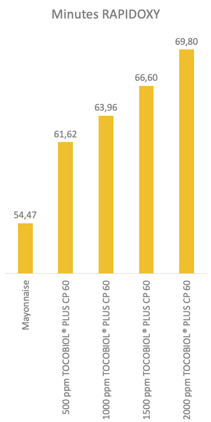 These results confirm that TOCOBIOL® provides effective antioxidant protection in high-fat emulsified systems and performs well. Its efficacy supports its use as part of a clean-label reformulation strategy in mayonnaise and similar products.