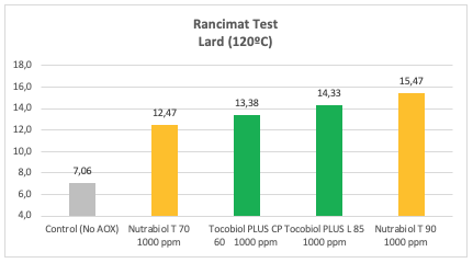 Allo stesso modo, il grafico seguente mostra l’effetto sinergico di due miscele sinergiche di tocoferoli, palmitato di ascorbile e lecitina in un grasso saturo, come lo strutto, riuscendo a stabilizzare il campione allo stesso modo dei tocoferoli misti standard (70% e 90%).