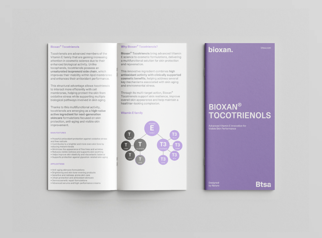Bioxan® Tocotrienols representa la próxima generación de activos de vitamina E para formulaciones cosméticas avanzadas. Mientras que los tocoferoles se utilizan ampliamente en el cuidado de la piel, los tocotrienoles son cada vez más reconocidos por su mayor actividad biológica y sus amplios beneficios para la piel. Su exclusiva cadena lateral isoprenoide insaturada mejora la movilidad dentro de las membranas celulares, lo que permite una protección antioxidante más eficaz y múltiples mecanismos de apoyo a la piel. Como resultado, los tocotrienoles Bioxan® proporcionan una solución multifuncional de gran valor para las formulaciones modernas de cuidado de la piel dirigidas al envejecimiento cutáneo, el estrés ambiental y las imperfecciones visibles de la piel.