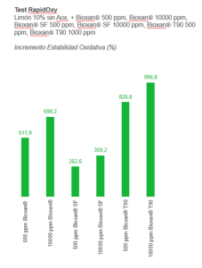 Se trataron muestras de aceites esenciales de limón y naranja con Bioxan®, Bioxan® SF y Bioxan® T90, en dosis de 500 ppm y 1000 ppm.