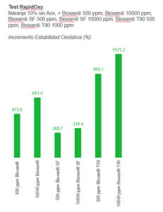 El uso de Bioxan® mejoró la estabilidad oxidativa en todos los casos, alcanzando un sorprendente aumento del 996,8% en el caso de Bioxan® T90 a 1000 ppm para el aceite esencial de limón. En el caso del aceite esencial de naranja, el aumento para el mismo antioxidante natural fue aún mayor, alcanzando el 1121,2%. Estos resultados revelaron un retraso significativo de la oxidación, lo que confirma la eficacia de Bioxan®.