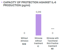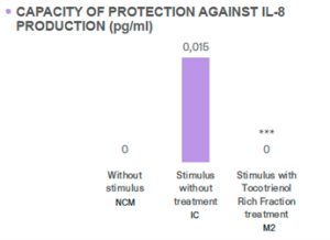 Además, en un estudio in vitro realizado por Btsa, el 1 % de tocotrienoles Bioxan® ha demostrado efectos protectores en modelos de queratinocitos humanos, las principales células epidérmicas implicadas en la respuesta inflamatoria. Reducen significativamente las citocinas proinflamatorias como la IL-1β, la IL-6 y la IL-8 tras la exposición a un agente inflamatorio, como se muestra en las figuras 1, 2 y 3.